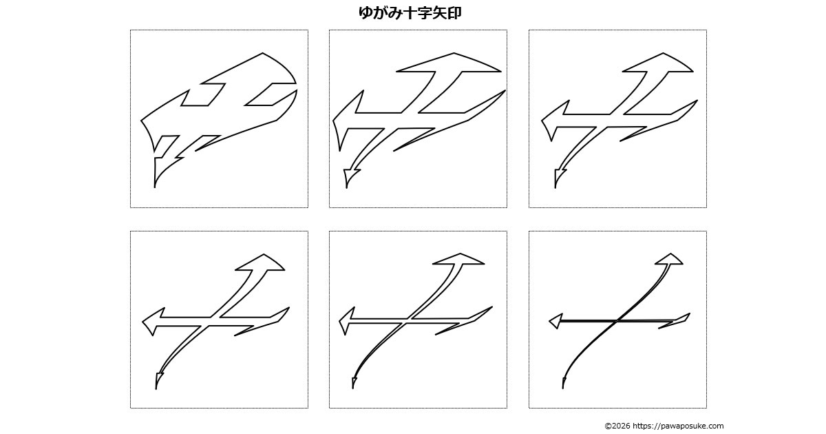 形がねじれたり波打ったりした不安定なラインの十字矢印で、動的・実験的な印象を与える。